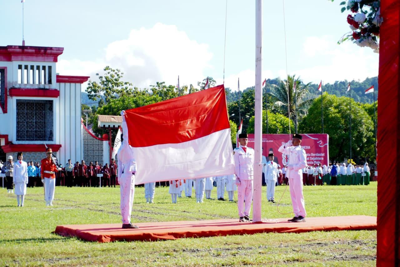 WARITA.net – Pemerintah Kabupaten Bolaang Mongondow Selatan menggelar upacara bendera dalam rangka memperingati Hari Ulang Tahun ke-80 Kemerdekaan Republik Indonesia di Alun-alun Molibagu Kec. Bolaang Uki, Minggu pagi (17/8/2025).